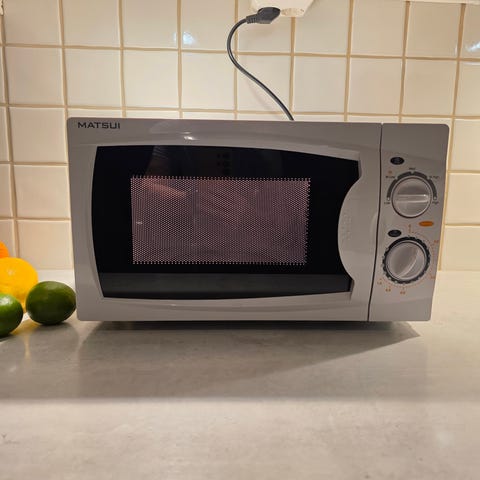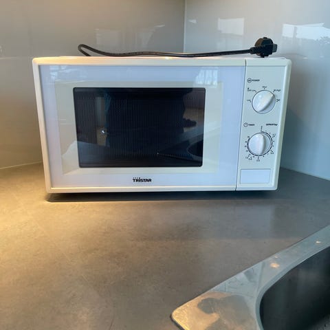 Samsung mikrobølgeovn i hvit utførelse. Modellen har mekaniske brytere for innstilling av effekt og tid, samt frontåpning med sidehengslet dør og vindu. Passer til enkel oppvarming og tining av mat på kjøkkenet. Nærmere spesifikasjoner som effekt, volum og modellbetegnelse er ikke oppgitt.
