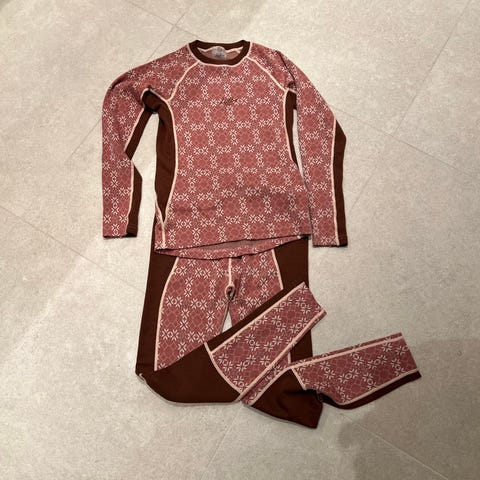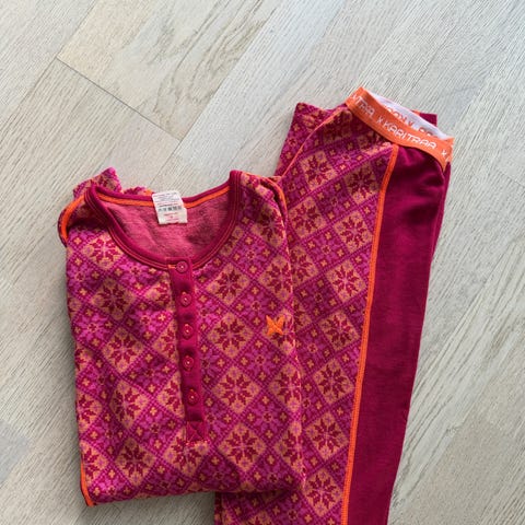 Kari Traa ullundertøy i størrelse S. Trøye og tilhørende longs. Trøya har knappåning øverst i front. Pent brukt.