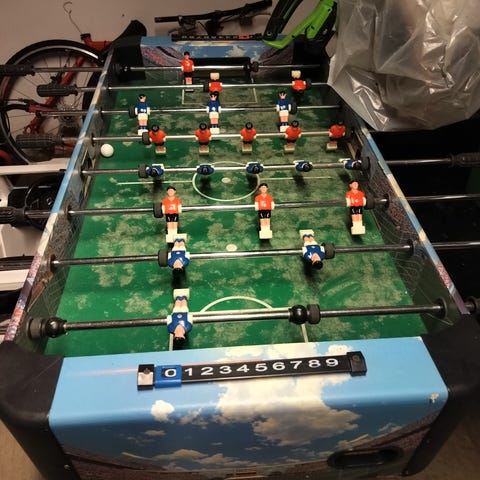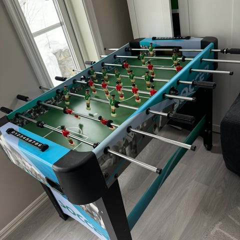 Bordfotballspill med grønn spilleflate og markeringer som fotballbane. Spillet har flere rader med spillere i rødt og hvitt, montert på stenger med håndtak på sidene. I hver ende er det mål og manuell målteller. Egnet for innendørs bruk på bord eller gulv for to eller flere spillere.