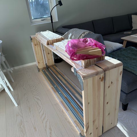 Pent brukt dobbelseng selges. Består av 2 enkle rammer som henges sammen, løse sengebunner, 2 madrasser og en overmadrass.
