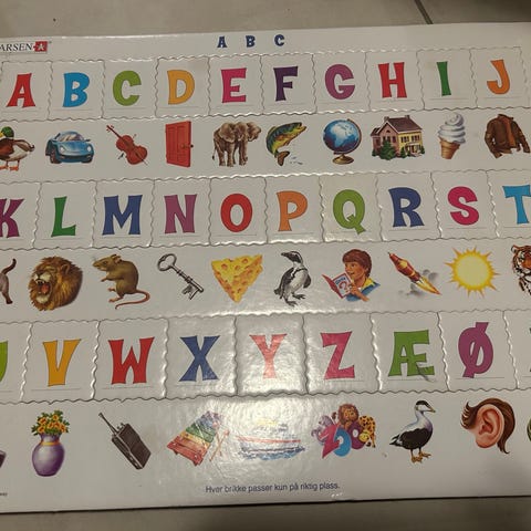 Tre alfabet-leke med roterende klosser med bokstaver og illustrasjoner. Hver rad viser store bokstaver i alfabetet, inkludert norske bokstaver, kombinert med enkle bilder som hjelper barn å koble bokstav og motiv. Leken står på et stativ i tre og kan brukes på bord eller gulv. Egnet som pedagogisk leke for barn som skal lære alfabetet og øve på bokstavkjenning.
