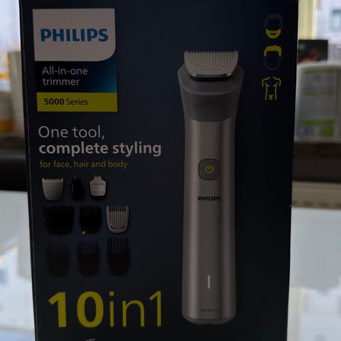 Multigroomer med flere utskiftbare hoder og kammer for trimming av skjegg, hår og kropp. Pakken inneholder trimmer, lader og ulike kammer for forskjellige lengder. Apparatet har ergonomisk håndtak og enkel betjeningsknapp på forsiden.