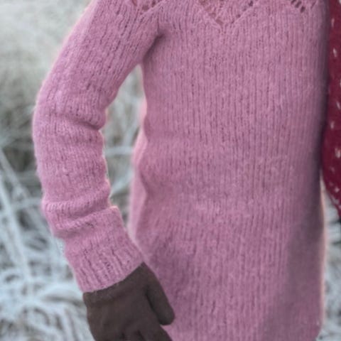 Pent brukt chunky hjemmestrikket genser i ull. Fresh rosafarge. Perfekt til våren/påske. God hals. En liten, nesten usynlig flekke på ryggen som sannsynligvis går vekk i vask. Genseren har aldri vært vasket. Brukt 2-3 ganger.