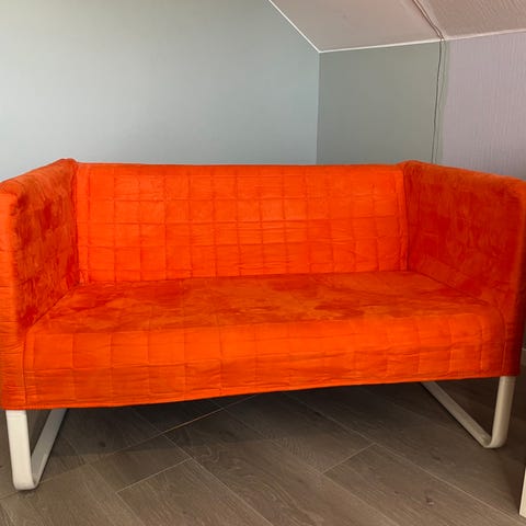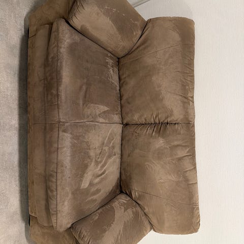 2-seters sofa i beige tekstil. Sofaen har rette armlener og to sitteputer med tilhørende ryggputer. Trekket ser ut til å være i et mykt, strukturert stoff. Passer som sittemøbel i stue, TV-stue eller gjesterom. Sofaen er plassert mot vegg og krever moderat gulvplass i bredden for to sitteplasser.