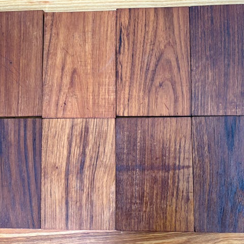 Fem smørefjøler i teak, 9cm x 14 cm. Jeg antar de er fra 60 tallet. To av dem har bruksmerker mens de andre tre er uten spor.