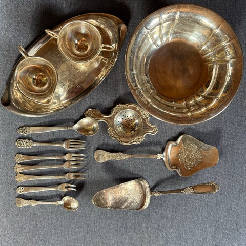 Dødsbo, må hentes i Kongsvinger i dag! diverse tinn- og metallgjenstander bordservise og lysestaker. Samlingen består av flere ulike deler i metall, blant annet kanner, skåler, fat, lysestaker og små bokser. Gjenstandene har ulike dekorative mønstre og relieffer langs kantene, med både enkle og mer ornamenterte detaljer. Settet kan brukes som bordservise, til servering eller som dekorative elementer i interiøret. Materialet fremstår som tinn eller lignende metall med patina som gir et eldre preg.