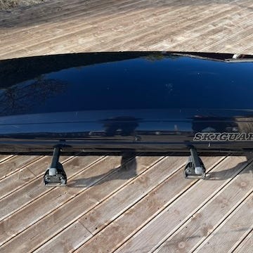 Autoform takboks i svart farge. Aerodynamisk modell med lav profil, egnet for montering på takstativ på personbil. Passer til ekstra bagasje, ski og annet utstyr på lengre turer. Åpnes fra siden og har festeanordninger til takstativ. Hentes på Os.