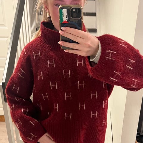 HÉST genser for dame i størrelse M. Genseren er blå og strikket i alpakkaull. Modellen har høy ribbestrikket hals, ribbekant nederst og ribbede mansjetter. Passer som varm og myk hverdagsgenser i kjøligere vær.