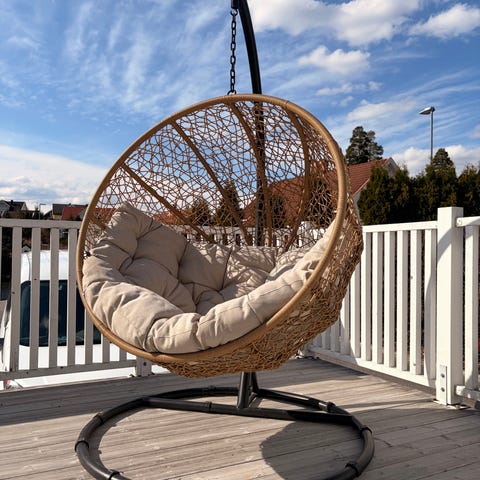 Rund hengestol i hvit makramé-stil. Stolen henges opp med tau i tak eller bjelke, og har åpen nettstruktur i setet og ryggen. Nederst er det frynser som dekor. Passer til bruk på balkong, terrasse eller innendørs der det er egnet oppheng og tilstrekkelig takhøyde. Materialet ser ut til å være tauverk/syntetisk fiber egnet for lett utendørsbruk, men bør oppbevares tørt når den ikke er i bruk for å bevare materialet lenger.