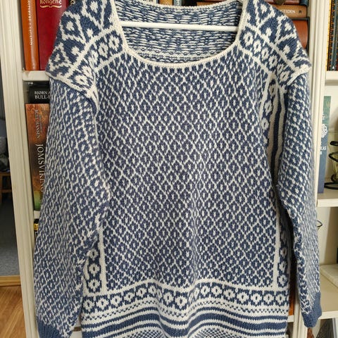 Håndstrikket genser i Rauma Finull – marineblå og turkis 💙