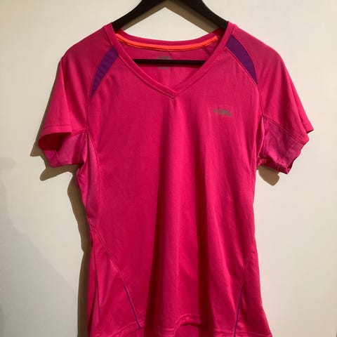 T-skjorta er laget i lett, teknisk materiale som egner seg til løping og annen trening. Passform tilpasset dame med paneler for bedre bevegelsesfrihet.