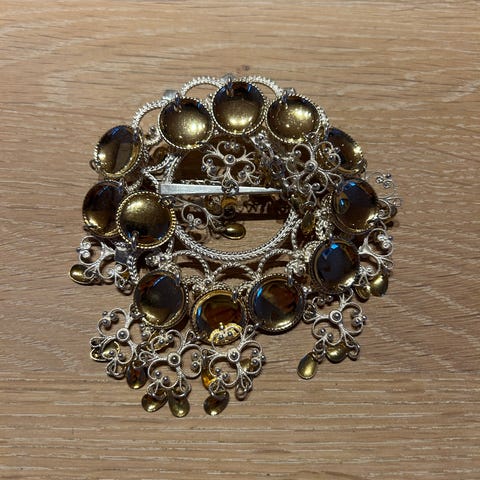 Selger en nydelig sølje som har gått i arv i arv. Søljen har tradisjonell rund form med flere heng og dekor. Passer til bruk på bunad eller andre plagg der man ønsker et tradisjonelt smykke i norsk stil. Festes med nål på baksiden.