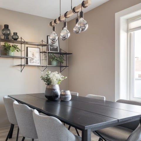 Lampen har et minimalistisk, industrielt design med sort metallramme og plass til 4 lyspærer. Den gir et flott og behagelig lys over spisebord eller kjøkkenøy, og passer perfekt i moderne eller skandinaviske hjem.