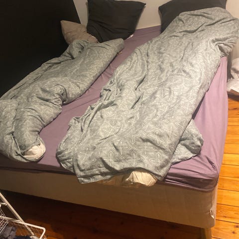 Kan brukast som dobbeltseng eller to separate senger. Ei seng har medium fastheit og ei har fast. Tekstilen er mørk grå.