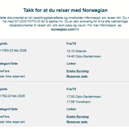 Norwegian flybillett Tromsø–Oslo t/r 23.-28. juni 2026