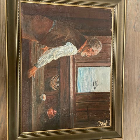Maleri maritimt motiv med seilbåt i gullfarget ramme