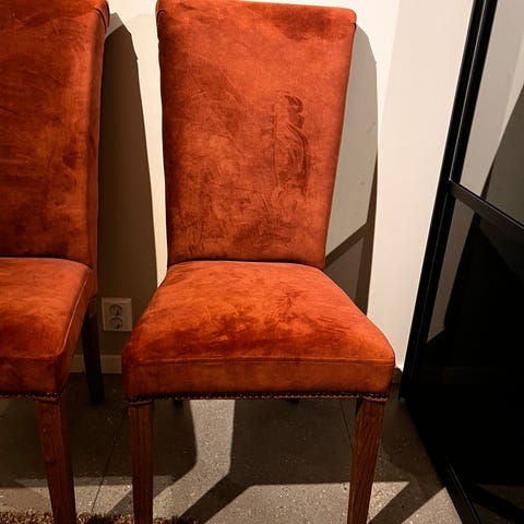 Selger 6 hele Henriksdal-stoler fra IKEA med sorte ben og rødt/oransje trekk. Trekkene er godt brukt og litt falmet, men ingen rifter eller hull.