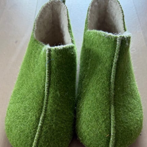 Ulltøfler med høy helkappe (100% ren ull). Fargen er grønn med såle i skinn.