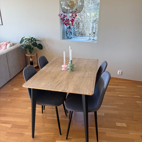 Spisebordet og understell stoler er i heltre eik, behandlet med hvitpigmentert olje.