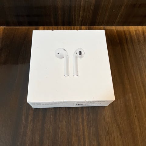 Apple AirPods trådløse hodetelefoner i hvit farge. Leveres med ladeetui og ladekabel, slik det vises på bildene. Hodetelefonene kobles trådløst til kompatible enheter via Bluetooth og oppbevares i etuiet når de ikke er i bruk. Etuiet fungerer også som lader for øreproppene. Passer til daglig bruk med mobil, nettbrett eller andre enheter som støtter trådløs tilkobling.