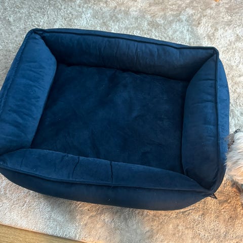 Rektangulær hundeseng i blått stoff. Sengen har høye, myke kanter på alle sider og en polstret bunn som gir støtte og komfort til hunden. Avtakbart trekk som kan vaskes. 107 cm lengde/77 cm bredde/ 28 cm høyde.