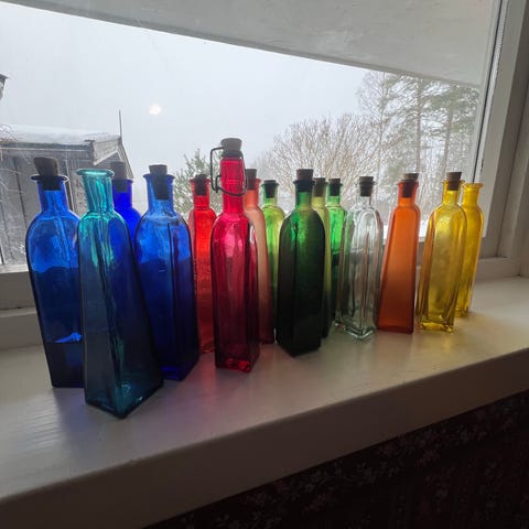 Sett med blå glassflasker og krukker til dekorasjon. Består av flere flasker i ulike høyder og fasonger med kork, samt to større krukker med lokk. Alle deler er laget i gjennomfarget blått glass og egner seg som pyntegjenstander på bord, hylle eller i vitrineskap. Passer til bruk enkeltvis eller samlet som et dekorativt blikkfang i interiøret.