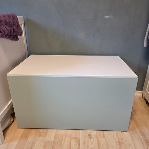 IKEA oppbevaringsbenk til barnerom i hvit utførelse. Benken har lokk/topp som kan brukes som sitteflate og en stor uttrekksskuff med håndtak i sidene for enkel åpning og flytting. Inni skuffen er det to separate, tekstilkledde oppbevaringsbokser i rødt stoff med motiv, som kan tas ut ved behov. Egnet til oppbevaring av leker, klær eller annet utstyr på barnerom eller i gang.