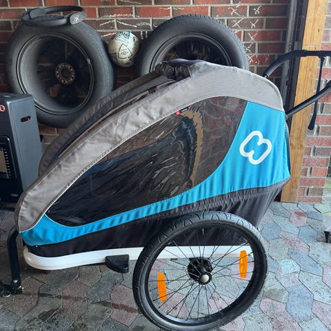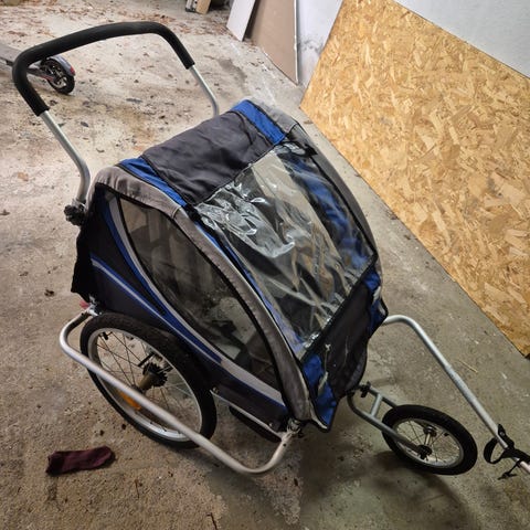 Nordic Cab sykkelvogn i blå farge. Vognen har plass til barn og er utstyrt med store hjul for stabil kjøring. Den har vindu- og nettingpaneler på sidene for utsyn og lufting, samt frontåpning med klar plast og netting. Innvendig er det sitteplass med ryggstøtte og festepunkter for seler. Vognen har håndtak bak slik at den også kan trilles som barnevogn når den er utstyrt med passende frontløsning. Sykkelfestet foran gjør at vognen kan kobles til sykkel. Egner seg til transport av barn på tur og hverdagsbruk. Det anbefales å bruke godkjente seler og hjelm til barna ved sykling.kjøpt i 2012 .lite brukt.