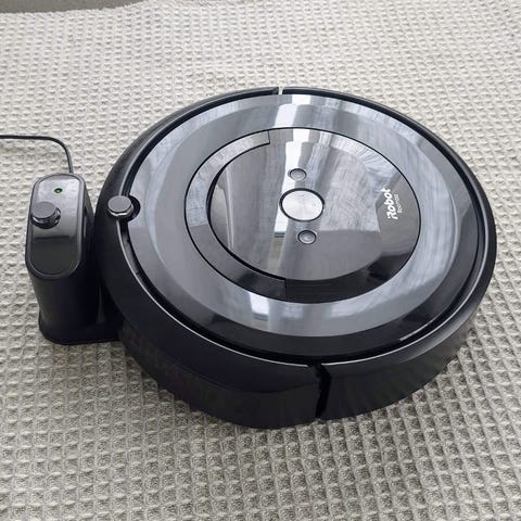 iRobot Roomba robotstøvsuger i hvit og svart utførelse. Enheten er rund og leveres med ladestasjon som kobles til strøm med ledning. Robotstøvsugeren er egnet for automatisk støvsuging av gulvflater i hjemmet, som harde gulv og tepper, avhengig av modellens kapasitet.