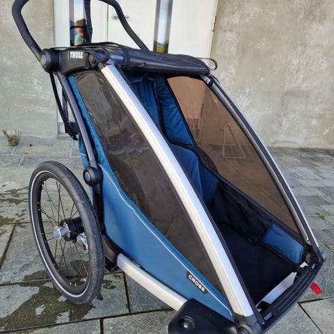 Pent brukt Thule Chariot 2 sykkelvogn selges. Vognen er fra 2020, og har stått mye inne/ lite brukt siste par år. Selges komplett med solskjerm, regntrekk og sykkelkobling. Jogging kit medfølger også. Noen små bruksmerker og litt rust på nipler etc.