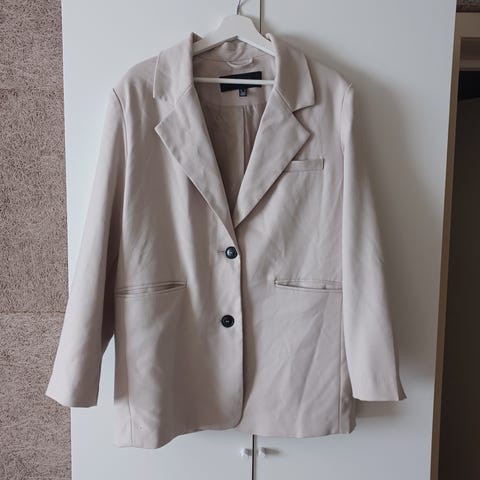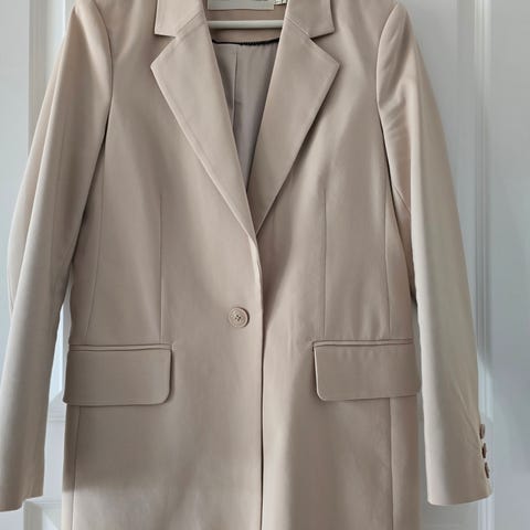 Bik Bok blazer for dame i størrelse M. Blazeren er beige med diskrete striper og har klassisk krage, to knapper foran og klaffelommer. Ermene har knappedetaljer nederst. Passer til både hverdags- og penere antrekk, og kan brukes alene eller som del av et sett dersom man har matchende bukse eller skjørt.