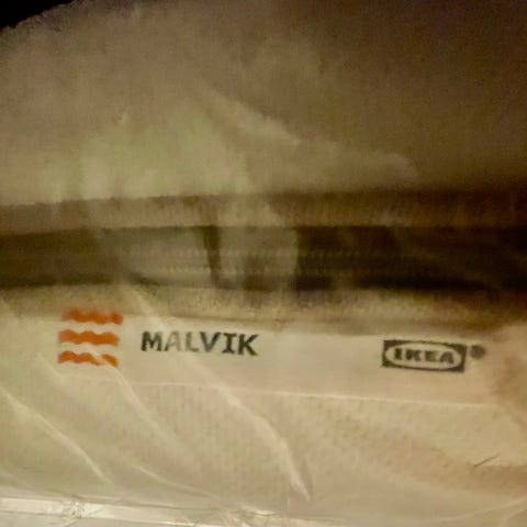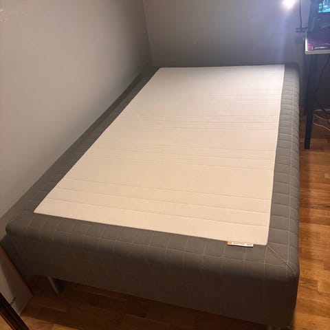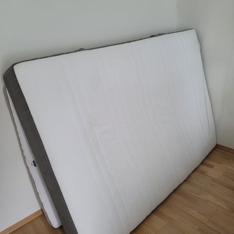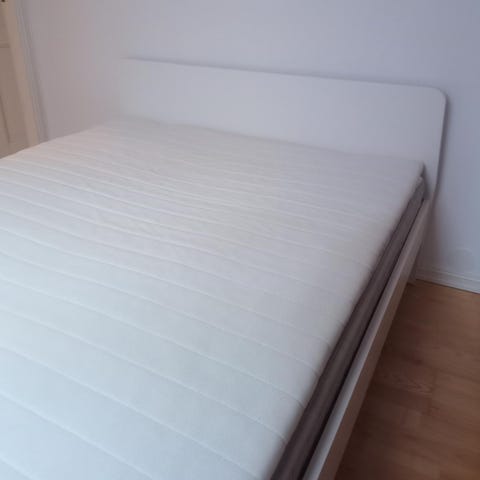 IKEA Sultan madrass i hvit tekstiltrekk. Madrassen har rette kanter og et ensfarget, lyst overtrekk. En grå Hövåg madrass på toppen kan følge med. Sengen er benyttet på en hybel og Sultan madrassen med ben fremstår som lite brukt. Hentes på Årnes.