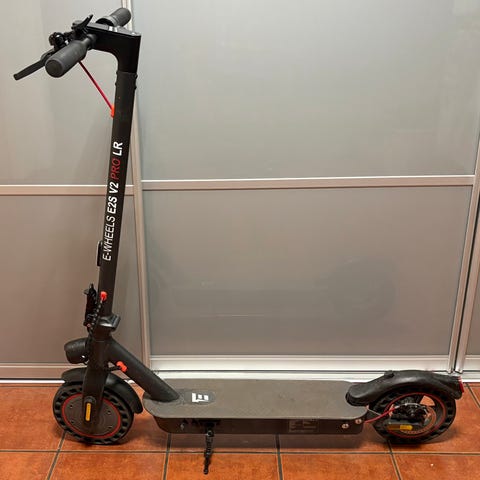 E-Wheels E2S V2 el-sparkesykkel i svart. Modellen har sammenleggbar konstruksjon for enkel lagring og transport. På styret er det digitalt display som viser hastighet og batterinivå. Sparkesykkelen har med lader og brukermanual, slik det vises på bildene. Elektrisk sparkesykkel til bruk på korte og mellomlange turer der el-sparkesykkel er tillatt brukt.
