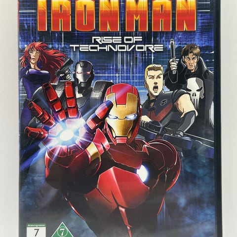 DVD-utgave av den animerte filmen «Iron Man: Rise of Technovore». Språk og tekst er oppgitt på omslaget. Aldersgrense er merket på coveret. Standard DVD-format som kan spilles av på kompatible DVD-spillere.