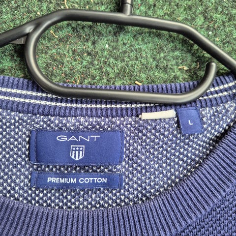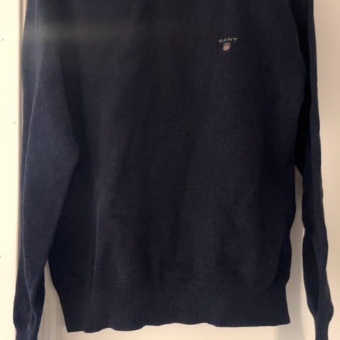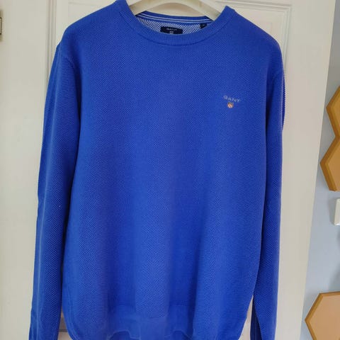 Gant genser for herre i størrelse L. Genseren er blå og strikket i 100 % bomull. Rund hals og lange ermer.