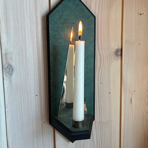Svensk design vegglysestake i svart metall av Olsson & Dåm. Lysestaken monteres på vegg. Den har en elegant smal spiss form og en bakplate som beskytter veggen. Passer til standard kronelys.