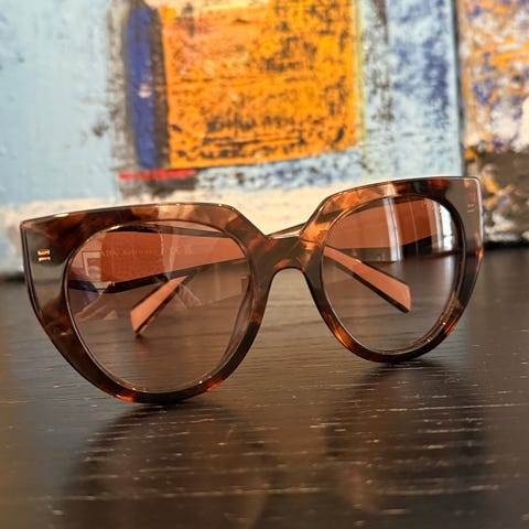 Celine solbriller med brun, mønstret innfatning . Modellen har hel ramme rundt glassene og rette stenger med Celine-logo på siden. Mørke brilleglass. Leveres med mykt etui som vist på bildene.