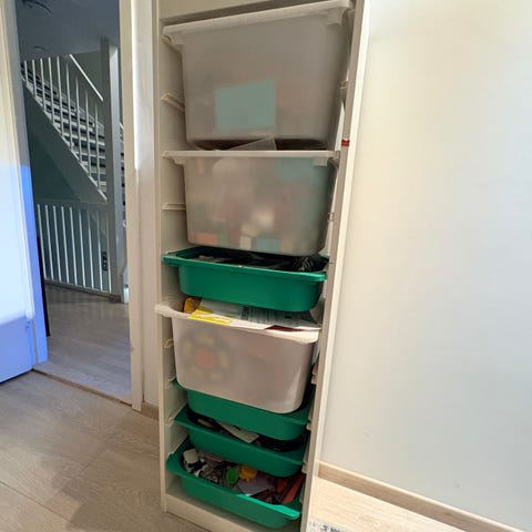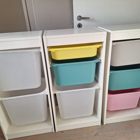 IKEA oppbevaringshylle for barn med plastkasser i ulike farger. Hyllen består av et treramme-system med flere rom der det står uttrekkbare plastkasser i forskjellige størrelser. Løsningen er egnet til oppbevaring av leker, tegnesaker eller annet barneutstyr. Kan plasseres på barnerom, lekerom eller andre rom der det er behov for oversiktlig oppbevaring i barnehøyde.