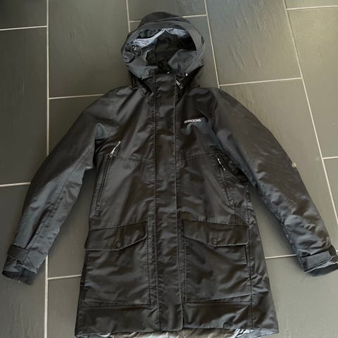 Didriksons vinterjakke for dame i størrelse 34. Jakken er grønn og laget i polyester. Modellen har hette og lengre passform som går ned over hofter/lår. Ifølge merkelappen er jakken vanntett (100% waterproof). Egnet som ytterjakke i kaldere vær og til hverdagsbruk i vinterhalvåret.