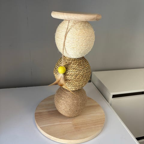 Klorestativ til katt med stolpe i sisal og grå bunnplate. Nederste del av stolpen er trukket i grått tekstil, mens øvre del er viklet med sisaltau for kloring. På toppen henger en myk lekeball i snor som gir ekstra aktivisering for katten. Egner seg som klore- og lekeplass for innekatten og kan plasseres på gulv i ulike rom.