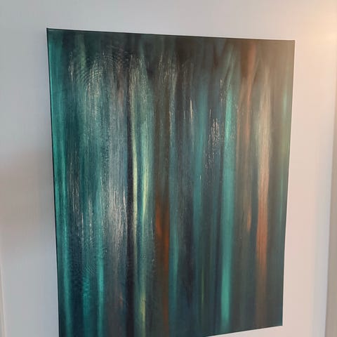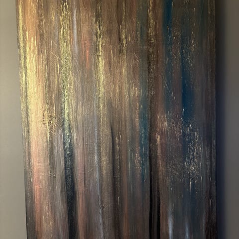 Abstrakt maleri på lerret i brune, svarte og hvite toner. Bildet har et ekspressivt, strukturert uttrykk med tydelige penselstrøk og lag av maling. Motiv og komposisjon er ikke-figurativ, med diagonale og vertikale strøk som gir et dynamisk preg. Maleriet er egnet som veggdekor i for eksempel stue, gang eller kontor. 40x50
