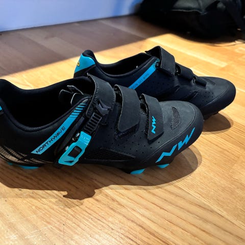 Skoen selges grunnet at den er for liten for undertegnede, jeg endte med størrelse 45 en størrelse over hva jeg vanligvis bruker. Det er små merker etter SPD kloss montering. De er kun testet i pedal i garasjeanlegg.