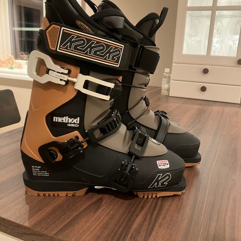 K2 FL3X Method alpinstøvler i brun og svart farge. Støvlene har tre spenner og bredt powerstrap øverst for god justering rundt leggen. Yttersålen har grovt mønster for bedre feste ved gange på snø og is. Modellen har skall som kan varmetilpasses (shell heat moldable) for bedre passform. Egnet til alpint/frikjøring i alpinanlegg.