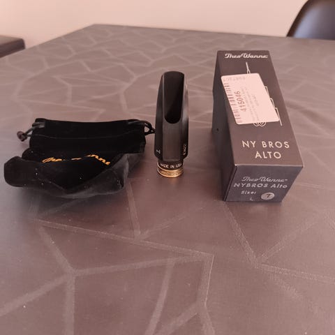Theo Wanne Durga munnstykke for altsaksofon i metall åpning 7. Munnstykket leveres med original eske, etui og tilhørende verktøy som vist på bildene. Er brukt ca 50 timer, ingen skader.