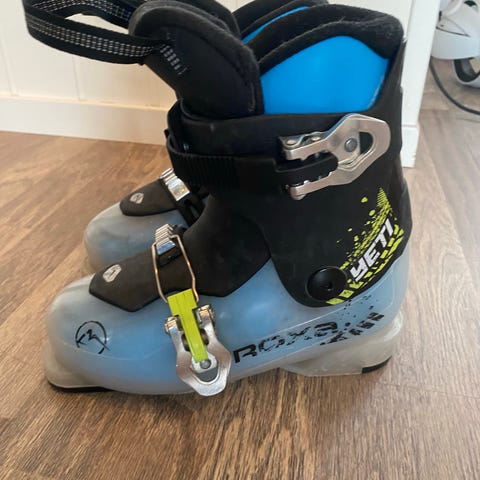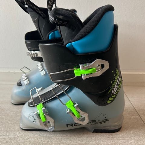 Roxa alpinstøvler med sålelengde 288 mm. Støvlene har fire spenner i metall med grønne detaljer og justeringsmuligheter for passform. Ytterskallet er i blå og svart plast med høy skaftkonstruksjon for støtte rundt ankel og legg. Egnet til alpin kjøring i preparerte bakker.