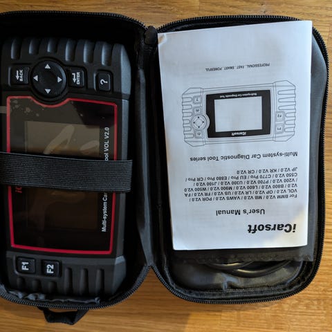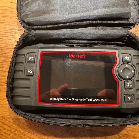 iCarsoft i906 bildiagnoseverktøy. Håndholdt diagnoseenhet for bil med skjerm og navigasjonsknapper. Enheten kobles til bilens diagnosekontakt (OBD) for avlesning og sletting av feilkoder samt visning av relevante data fra bilens systemer. Passer til bruk ved feilsøking og kontroll av bilens elektroniske systemer. Fungerer som et multisytem diagnoseverktøy for bil. Veldig lite brukt. Alt følger med.
