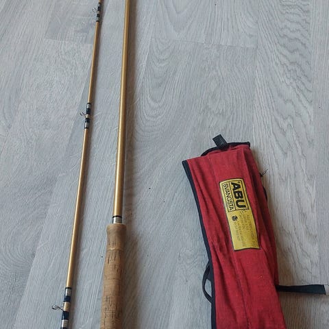 Vintage laksestang og snelle. Vil helst selge komplett, Fluesnella er hel og fungerer, men har noe bruksslitasje. 3 delt laksestang i samme stanf - hel, men synlig brukt. Fabrikkmerke er slitt bort så ukjent type stang.