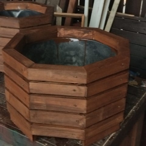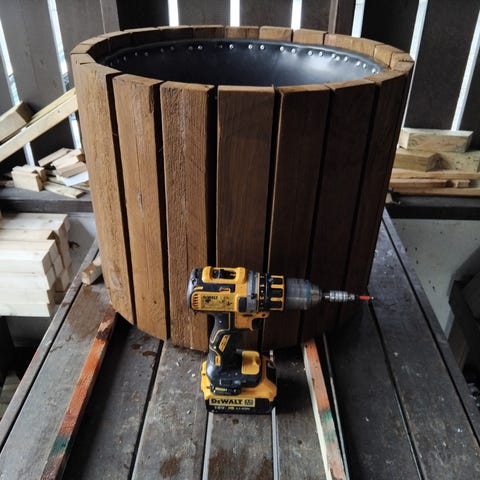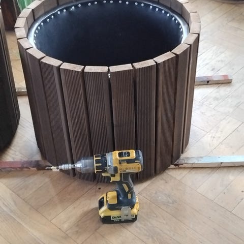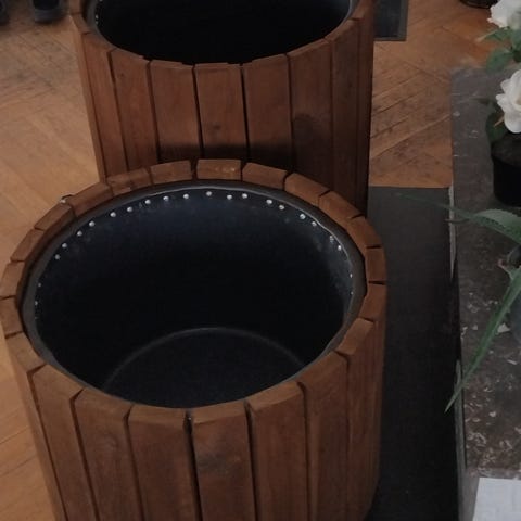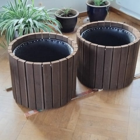 1 STK STOR RUND BLOMSTERKASSE MED PLAST BALJE INNVENDIG IMPREGNERT MATERIALE FERDIG BEISET KLAR TIL BRUK