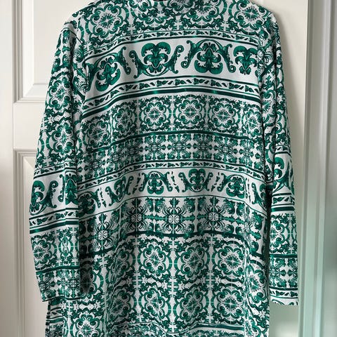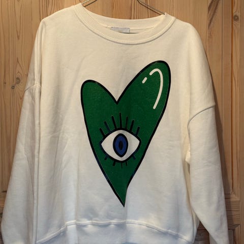 Monki genser for dame i størrelse XL. Genseren er laget i bomull og har et flerfarget mønster med grønt på lys bunn. Passformen fremstår som romslig og komfortabel, med lange ermer og rund hals. Egner seg til hverdagsbruk og kan kombineres med både bukser og skjørt.