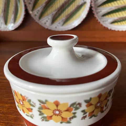 1 Sildeterrin + 2 sild/smørkrukker, uten skader/nag og med lokk. Fine og sterke farger. Nesten som nye, uten krakelering.